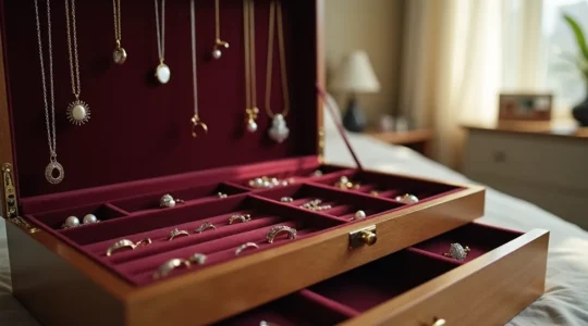 L’emplacement de votre boîte à bijoux importe également. La table de nuit et la salle de bain constituent les pires choix : humidité excessive, variations de température et premier endroit fouillé en cas de cambriolage. Préférez un dressing ou une armoire fermée dans une pièce sèche.