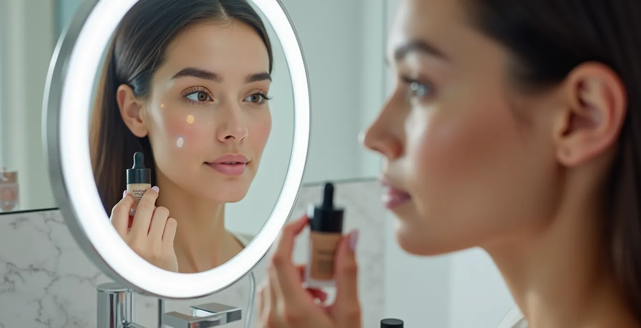 Une vidéo « avant/après » montrant un fond de teint qui efface toute imperfection en un seul passage est rarement une représentation fidèle. La magie opère souvent grâce à trois facteurs invisibles : un éclairage de studio professionnel (ring light), des techniques d’application expertes et, surtout, l’usage systématique de filtres de lissage. Les algorithmes de retouche en temps réel sont si sophistiqués qu’ils créent une texture de peau parfaite, sans pores ni ridules, que même le meilleur des produits ne pourrait atteindre. Juger l’efficacité d’un soin ou d’un fond de teint sur une image déjà perfectionnée par une IA est un non-sens. Vous n’évaluez pas le produit, mais la performance du filtre.