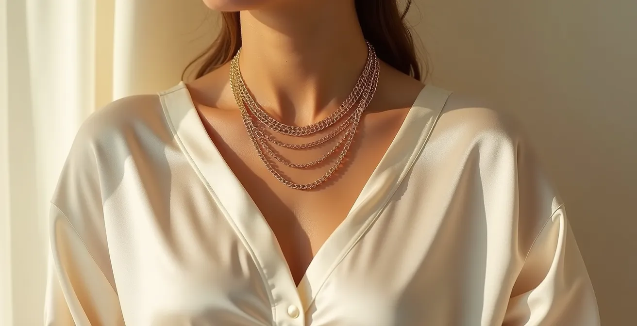 Ces réflexes constituent une base, mais ils omettent une dimension essentielle du stylisme. Et si la véritable clé n’était pas dans une simple correspondance de formes, mais dans une vision plus globale, une composition artistique ? Le collier n’est pas un simple accessoire posé sur la peau ; il est l’élément qui vient orchestrer le dialogue subtil entre la matière de votre haut, les volumes de votre tenue, votre morphologie et l’équilibre général de votre silhouette.